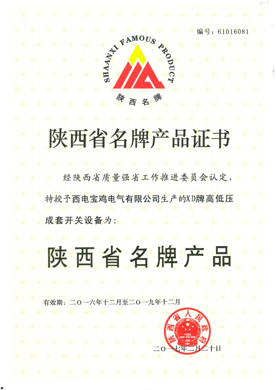 2、2月20日,陜西省人民政府陜政辦函(2017)51號文件公布我公司申報的XD牌高低壓開關(guān)設(shè)備再次榮獲陜西省2016年名牌產(chǎn)品稱號。
