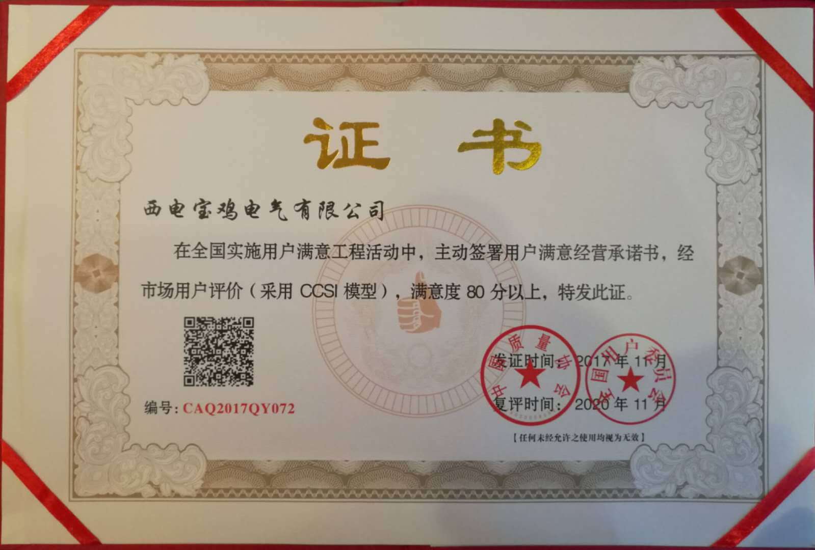 9、11月份,在寧波召開的2017滿意中國和2017年全國實(shí)施用戶滿意工程推進(jìn)大會上,我公司獲得“全國用戶滿意企業(yè)”榮譽(yù)稱號。