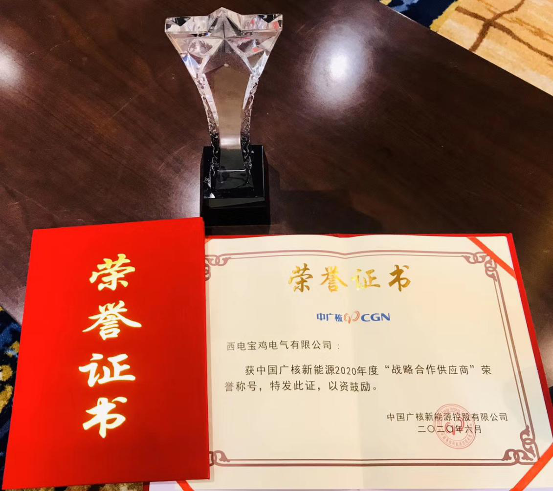 6月11日,在北京召開的中國廣核新能源控股有限公司2020年供應(yīng)商大會上,西電寶雞電氣榮獲該公司“2020年度戰(zhàn)略合作供應(yīng)商” 榮譽(yù)稱號。